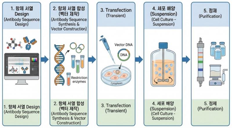 엔지틴의 항체 위탁 생산 서비스는 바이오 의약품 생산의 표준인 CHO Cell(Chinese Hamster Ovary)과 Protein A Affinity Chromatography 공정을 기반으로 합니다. 유전자 합성부터 정제까지 최적화된 Transient Transfection 시스템을 통해, 초기 R&D 및 비임상 연구에 즉시 활용 가능한 고순도 항체를 신속하게 공급해 드립니다